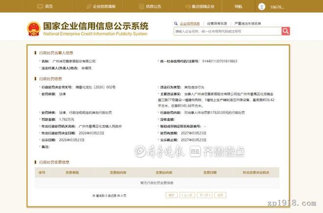 廣州市番禺區化龍鎮人民政府依據相關法律法規,結合違法事實,對當事人作出罰款1.782萬元的行政處罰。此次處罰有效期至2027年3月23日,相關信息已于2026年3月23日啟動公示,公示截止期為2027年3月23日。